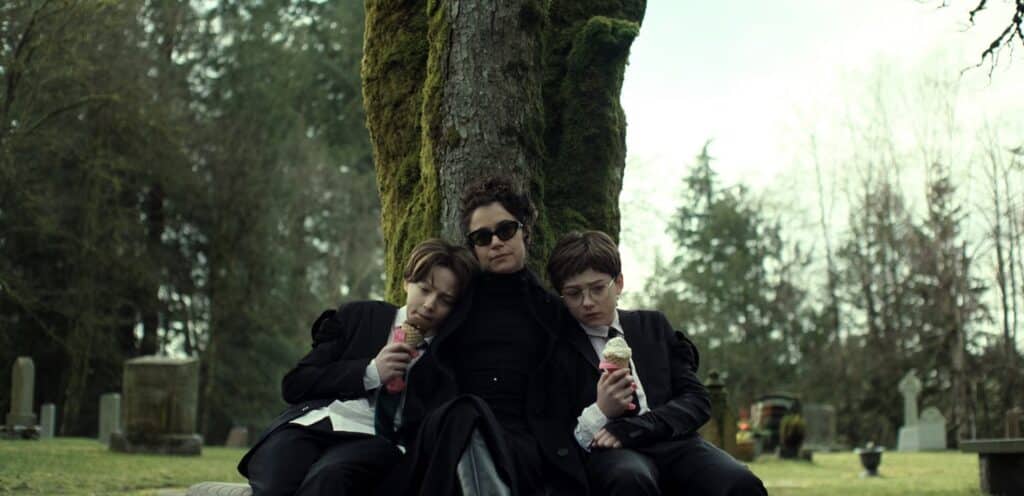 A pivotal part of the narrative centers on the twin sons of the pilot, introduced in a flash-forward that sees Christian Convery portraying their younger selves and Theo James stepping into the roles as adults. The brothers, Hal and Bill Shelburne discover the monkey in a dusty attic and soon find their lives irrevocably altered by its sinister powers. Their relationship is torn asunder by the cursed toy’s influence, which resurfaces throughout their lives to wreak havoc in a disturbingly comical fashion. Tatiana Maslany lends heartfelt gravitas in flashbacks as the twins’ beleaguered mother, offering a rare moment of poignant reflection amid the chaos.