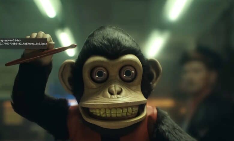 The story opens with a whimsically gnarly prologue featuring Adam Scott as a blood-drenched pilot, desperately trying to rid himself of a vintage monkey toy at a pawn shop. This cursed plaything, adorned with a little red vest and a tiny drum, is the catalyst for an intricate series of Rube Goldberg-like death sequences. Once its key is turned, the monkey’s macabre melody sets in motion a chain reaction of elaborate and over-the-top killings that span entire rooms and even front yards. The film wastes no time in establishing that when the monkey drums, death is inevitable—and often delivered in the most ludicrous, laugh-out-loud ways.